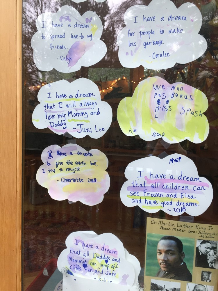 January Class “I Have a Dream” Clouds. These annually class made clouds guide us to explore our hopes for world peace. Inspiring to hear as an adult the depth of inner peace awareness each child holds in heart and thought for self, community and neighbor.