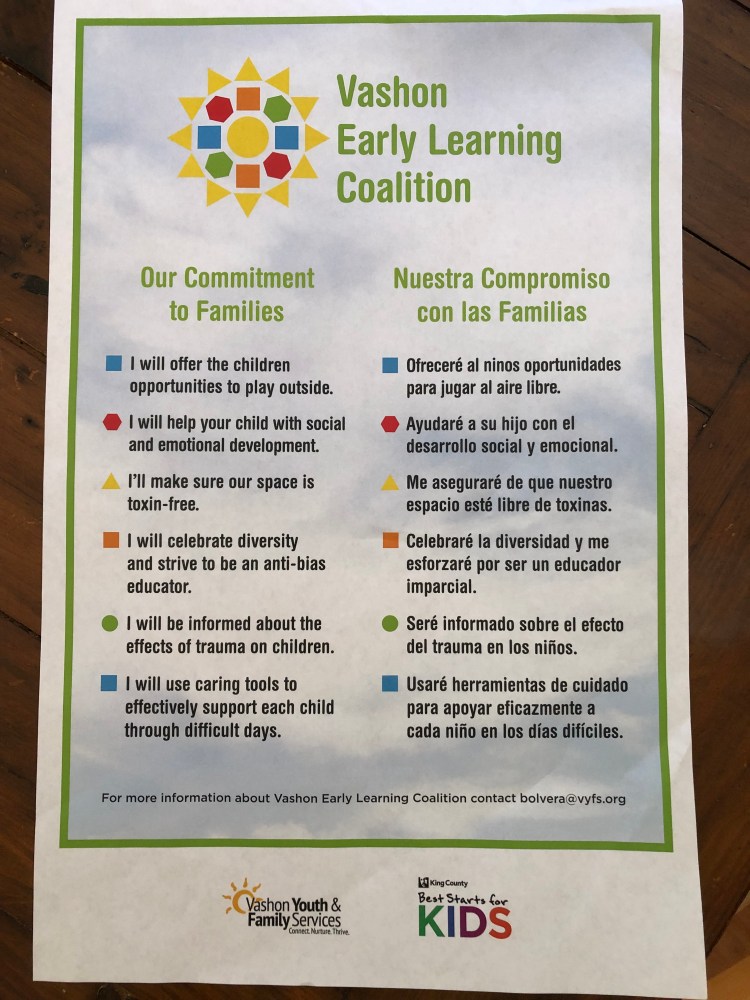 Honored for Klahanie School involvement to maintain humbleness in our continued education as we follow these commitments from our formed Vashon Early Learning Coalition. Commitment to learning how to best serve island children and family partnerships. Thank you Vashon Youth and Family Services for these community strengthening opportunities.