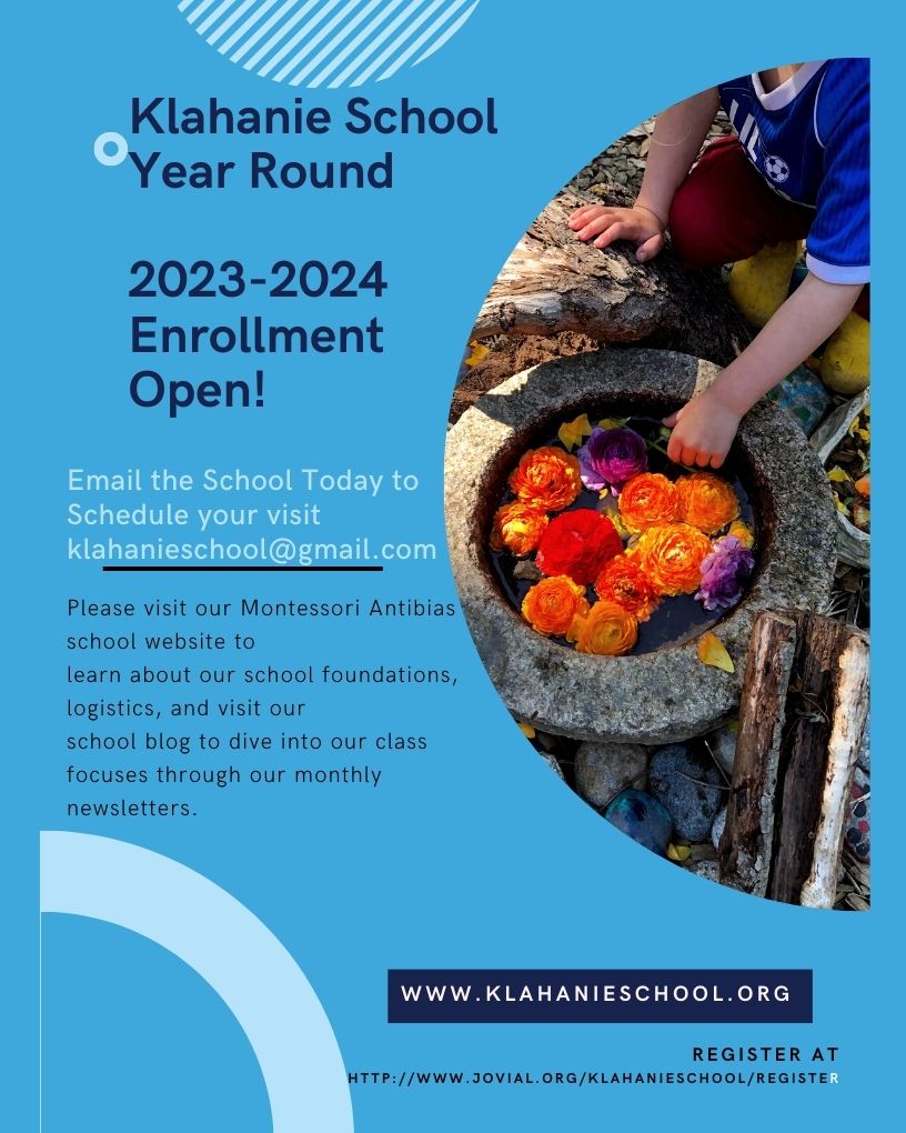 Happy 2023-2024 school year! Klahanie School has a couple more spots open in our fun-filled Year Round Montessori Multiage Antibias Early Education program. http://www.klahanieschool.org/