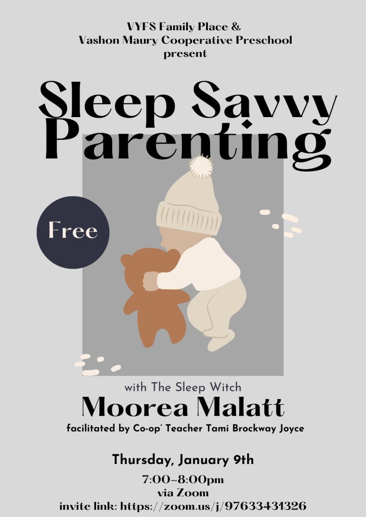 VYFS Family Place and Vashon Maury Cooperative Preschool present Sleep Savvy Parenting with the Sleep Witch, Moorea Malatt, facilitated by Co-op’s Teacher Tami. Moorea has worked with families for over 25 years, and as a sleep professional and lactation educator and counselor for over a decade. In that time, she has helped over a thousand families toward more restful sleep. Moorea will offer clear and actionable guidance to help parents get their own needs met and still parent gently and attentively. There’s a reason the families she works with call her the Sleep Witch!
